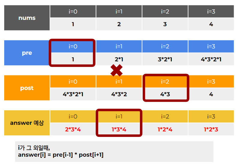 i = 0일때는 2*3*4가 똑같이 들어와야 한다. 이와 똑같은 값은 post[1]에 있는 값이다. 이때 post[0]과 pre[3]도 해당하는 거 아니냐고 생각할 수도 있지만, nums[0]값이 1이 아니라 다른 값이 들어오게 되면 값이 바뀌게 되므로 해당사항이 없다.