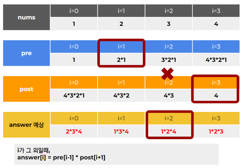answer에 저장한다.i가 0일 때 →answer[i]에post[i+1]의 값을 저장한다.i가 리스트의 길이일 때 →answer[i]에pre[i-1]의 값을 저장한다.i가 중간에 있는 값일 때 →answer[i]에pre[i-1] * post[i+1]의 값을 저장한다.