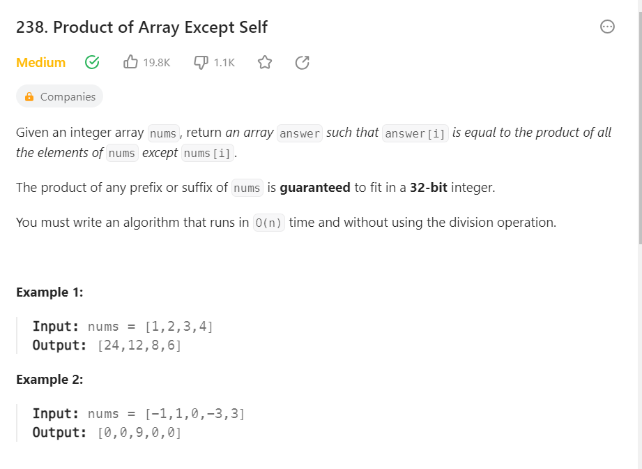 nums가 주어지면,answer[i]가nums[i]를 제외한nums의 모든 요소의 곱과 동일하도록 배열answer을 반환한다. nums의 접두어나 접미어의 곱은 32비트 정수에 맞도록 보장된다. (따라서 메모리는 걱정하지 않아도 된다)- 단, 나누기 연산을 사용하지 않고 O(n) 시간에 실행되는 알고리즘을 작성해야 한다.