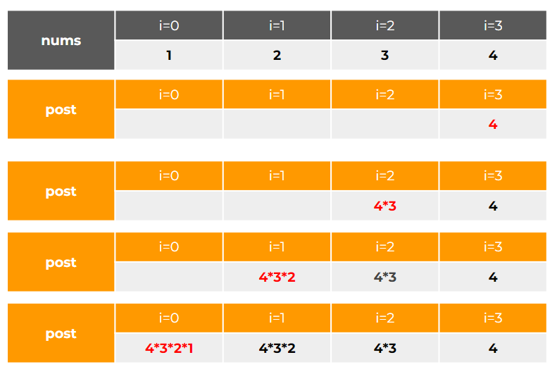 pre리스트에pre[i]에nums[i]와 그 이전의 값들을 곱한 값들이 저장된다.post리스트는post[i]에 nums[i]와 그 이후의 값들을 곱한 값들을 모두 저장한다.